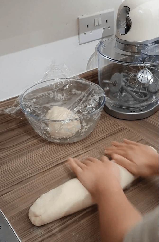 4. The dough should have risen after 20mins. Take half of it out and use a rolling pin to flatten it into a long rectangular/oblong shape, then role it into a cylinder shape. You can either cut these into even pieces and let rise or place the dough back into the bowl and pull a piece of dough as you go.