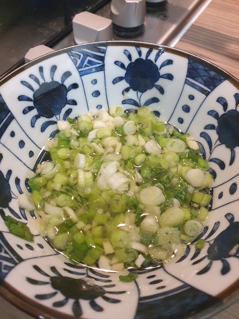 3. Pour the hot oil over the spring onions. It’ll sizzle as you do this. Stir and then let it rest until you’re ready to eat it.