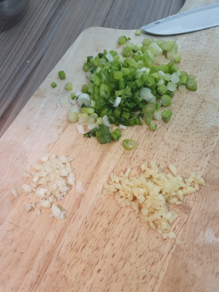- Chop the spring onions, garlic and shallot using a sharp knife and place in a bowl